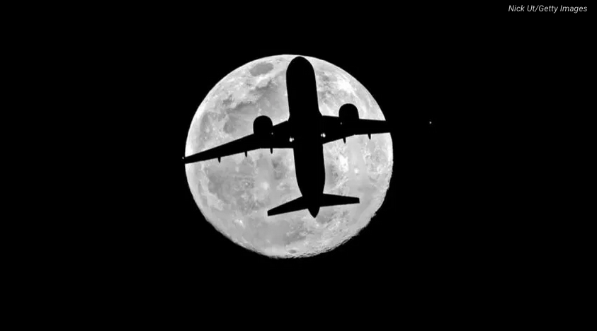 File image:  A plane flies in front of the moon as seen on Feb. 7, 2020